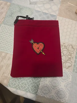 Elegante bolsa con un diseño de corazón flechado. - Adorno de corazón con lentejuelas rojas. - Flecha decorativa con detalles en dorado y negro. - Cierre de cordón ajustable. Alto 27cm y 22 ancho.