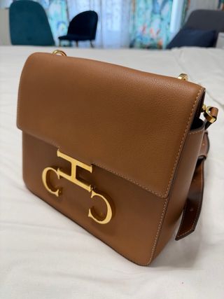 Elegante bolso de mano Carolina Herrera. - Color marrón con detalles dorados. - Logo CH distintivo en la parte frontal.