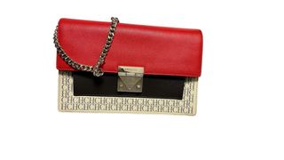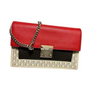 Elegante bolso de Carolina Herrera con un diseño tricolor. - Combinación de cuero rojo y negro. - Detalle de logo CH repetido en la parte inferior. - Cadena metálica plateada. - Cierre frontal con broche metálico. Dimensiones: ancho 28 cm, alto 18 cm detalle visible en las imágenes