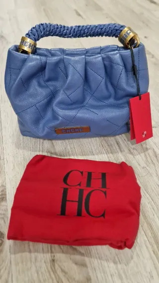 Bolso de mano Carolina Herrera en piel azul con diseño acolchado. - Asa trenzada. - Detalle metálico dorado en el asa. - Cierre fruncido. - Incluye funda guardapolvo roja con logo CH.