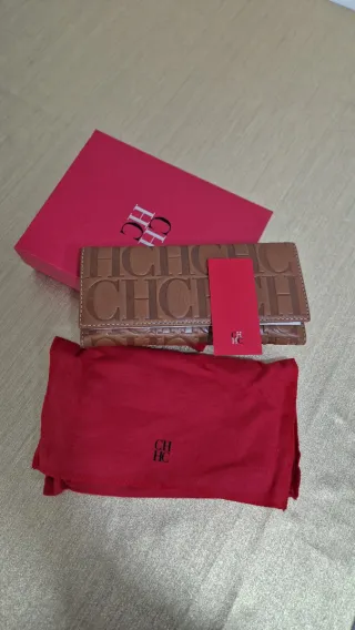 Elegante cartera de Carolina Herrera con un diseño distintivo. - Color marrón con detalles en rojo. - Acabado con el monograma CH de la marca. - Incluye caja y bolsa protectora.