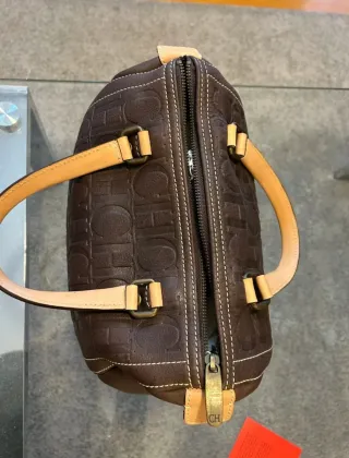modelo Andy Boston de Carolina Herrera. Está confeccionado en piel marrón con el icónico monograma CH grabado en relieve y tiene asas de mano en piel de color camel. Información del Producto Marca: Carolina Herrera Modelo: Andy Boston (también conocido como Andy Bag) Material: Piel (cuero) Color: Marrón chocolate con detalles en piel color camel Características: Logotipo CH grabado en relieve, pespuntes a contraste y dos asas cortas. Asas en perfecto estado, usado muy poco y muy cuidado . Certificado de autenticidad de CH