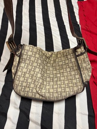 Precioso bolso bandolera de la marca Carolina Herrera. Es de color beige con el logo de la marca repetido. Tiene un asa larga de cuero marrón. Está en buen estado, aunque presenta un ligero desgaste por el uso. - Asa larga regulable - Cierre de solapa - Material: lona y cuero