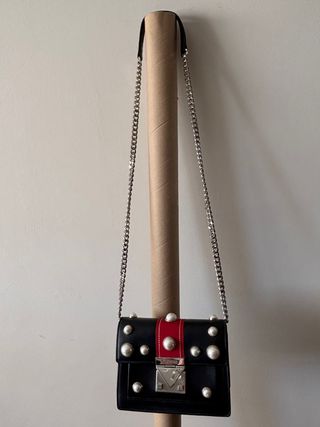 Elegante bolso de mano Carolina Herrera con detalles metálicos y cadena. - Diseño con tachuelas plateadas. - Tira central en color rojo. - Cierre metálico con logo. - Cadena plateada para llevar al hombro.