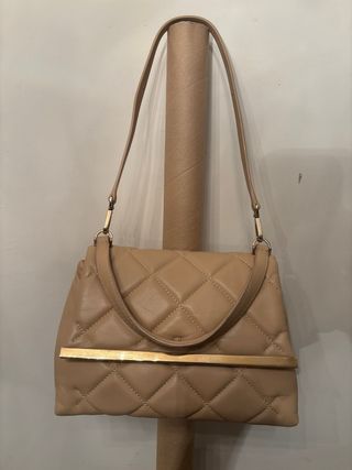 Elegante bolso de mano y hombro de Carolina Herrera. - Diseño acolchado en piel. - Detalle metálico dorado en la parte frontal. - Asa de hombro ajustable y extraible