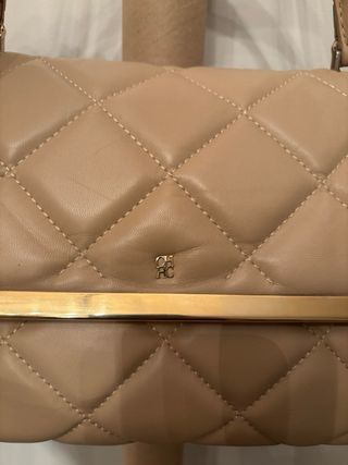 Bolso tipo clutch Carolina herrera, con mucha capacidad. Lo puedes llevar al hombro, bandolera o de mano. Color nude. Ideal para dar un toque a tu look o para un evento. Tiene algo de desgaste en esquinas. Medidas 29x15cm.