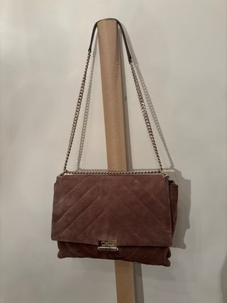 Elegante bolso de mano Carolina Herrera. - Material: ante - Color: marrón - Diseño acolchado con pespuntes en chevron - Cierre con solapa y detalle metálico - Cadena metálica para llevar al hombro