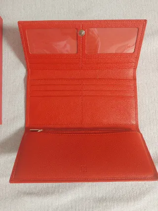 Elegante monedero de Carolina Herrera. - Color rojo vibrante. - Diseño con el logo de la marca grabado en relieve en la parte inferior. - Detalle metálico con las iniciales CH en la solapa.