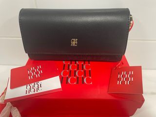Elegante billetera de Carolina Herrera. - Diseño en piel negra con detalles en rojo. - Logo CH dorado en la parte frontal.