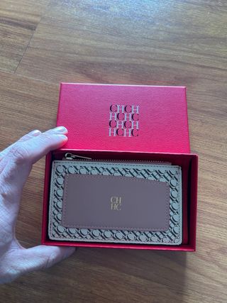Elegante billetera de Carolina Herrera con un diseño distintivo. - Patrón CH repetido en beige. - Detalle de cuero en tono marrón. - Cremallera superior. - Compartimento frontal.