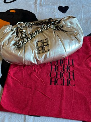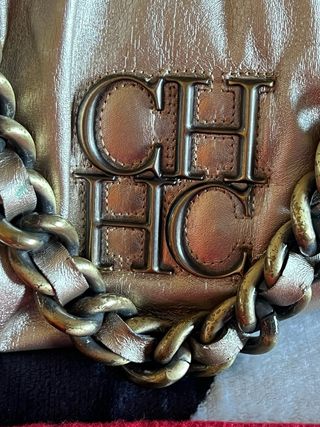Bolso de polipiel de Carolina Herrera. Color gris (ligeramente dorado) brillante, con asas que se asemejan a cadenas. Tiene algunos defectos propios del uso en la parte de abajo y en el borde de arriba (se pueden ver en las fotos) . El interior está en perfecto estado, dispone de un bolsillo interior. El cierre es de botón. Incluyo su guardapolvo original. #carolinaherrera #chhc #bolsomujer #womenpurse