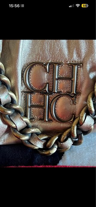 Bolso de polipiel de Carolina Herrera. Color gris (ligeramente dorado) brillante, con asas que se asemejan a cadenas. Tiene algunos defectos propios del uso en la parte de abajo y en el borde de arriba (se pueden ver en las fotos) . El interior está en perfecto estado, dispone de un bolsillo interior. El cierre es de botón. Incluyo su guardapolvo original. #carolinaherrera #chhc #bolsomujer #womenpurse #carolinaherreramujer