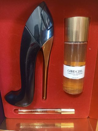 Set perfume good girl carolina herrera que incluye el perfume y un aceite corporal y versión perfemero bolsillo en su caja lo único que se evaporó un poco en la versión de bolso lo demás está nuevo tiene el perfume 80 ml y el aceite corporal 100 ml