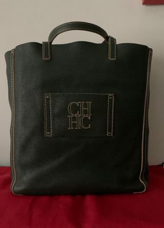 Bolso de cuero color verde pistacho con monograma CH pespunteado en letras grandes, es un clásico de la firma, forro interior con monograma y bolsillo interior con cremallera. ESTADO: Muy bueno, falta el tirador de la cremallera del bolsillo interior (se puede abrir y cerrar) leve roce en esquinas y asas, visible en las fotografías. Medidas ancho parte de arriba 37 cm, ancho en la base 27 cm, alto 21 cm, asas 45 cm.