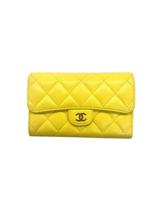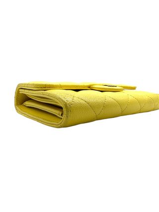 Cartera Chanel Classic Flap original en piel caviar amarilla, con diseño acolchado y logo CC en plateado. Compacta y elegante, con ranuras para tarjetas, compartimento para billetes y bolsillo con cremallera. Medidas: 15 x 9 x 2 cm. En excelente estado, sin marcas visibles. Una cartera Chanel auténtica de segunda mano, ideal para quienes buscan un accesorio de lujo con estilo y color. Entrega en mano en Barcelona o envío. Ref. 0520
