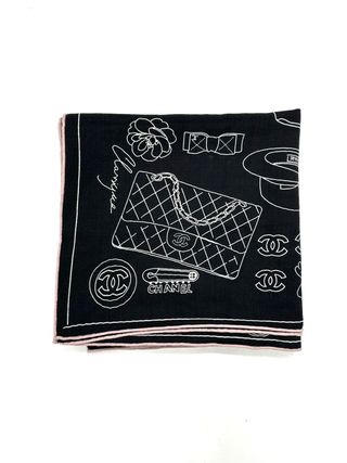 Pañuelo Chanel de segunda mano en excelente estado, confeccionado en mezcla de lana y seda en tonos negro y rosa. Presenta ilustraciones bordadas con elementos icónicos de la firma Chanel, como el bolso Classic Flap, la camelia y el logo CC. Con medidas generosas de 125x125 cm, es ideal para lucirlo al cuello, como accesorio de bolso o como foulard. Un accesorio de lujo versátil y atemporal. Ref. BCN 0542
