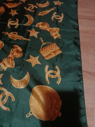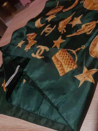 Pañuelo CHANEL auténtico, seda, color verde oscuro con estampado dorado de bolsos, estrellas y detalles icónicos de la marca. Tejido suave y ligero, ideal para cuello, cabello o bolso, un accesorio sofisticado y elegante. 🔹 Estado: muy bueno 🔹 Material: seda 🔹 Color: verde con dorado 🔹 Precio original: más de 400€ 🔹 Precio de venta: 80€ (negociable) 🔹 Entrega en mano en Barcelona ✅ Oportunidad única para conseguir un accesorio de lujo auténtico a precio increíble.