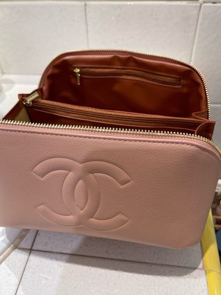 Neceser de la marca Chanel en color rosa. Un accesorio elegante y práctico. - Diseño acolchado. - Cierre de cremallera dorada. - Logo de la marca grabado en relieve.