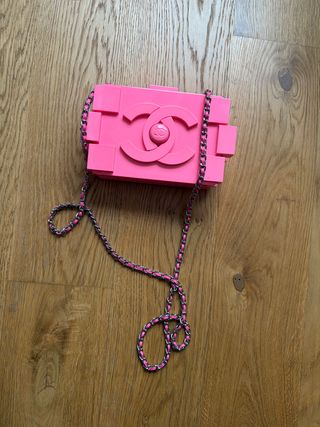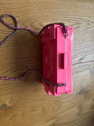 Bolso de mano con diseño llamativo. - Cadena metálica con detalles rosas. - Logo CC icónico en la parte frontal.