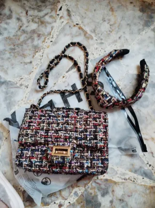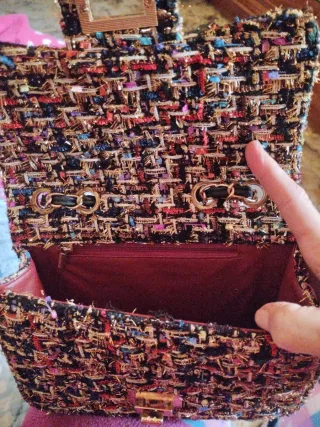Elegante bolso de tweed con un diseño vibrante y una cadena metálica. - Tejido de tweed con hilos multicolores. - Cadena de eslabones negros y dorados. - Cierre dorado. - Incluye un bolso de mano a juego.