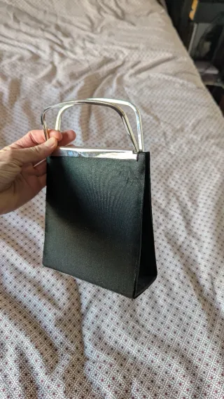Elegante bolso de mano para eventos especiales. - Diseño de terciopelo negro. - Asa superior metálica plateada. - Cadena larga desmontable para llevar al hombro.