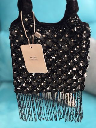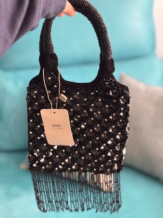Bolso de mano con un diseño llamativo cubierto de lentejuelas y detalles colgantes. - Marca: Rita Ora x Primark. - Nuevo con etiqueta. Sin estrenar. El bolso es una preciosidad, lo vendo por falta de espacio.