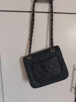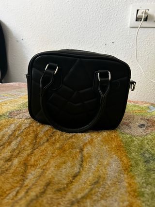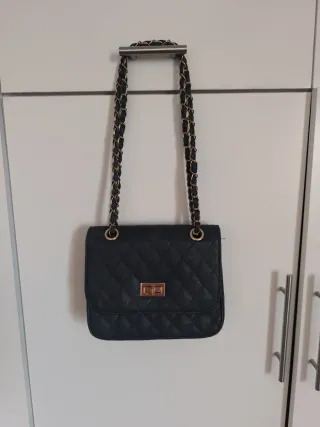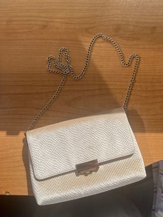 Elegante bolso de mano con cadena. - Diseño moderno con detalles metálicos. - Cadena plateada para llevar al hombro o cruzado.