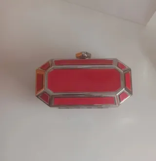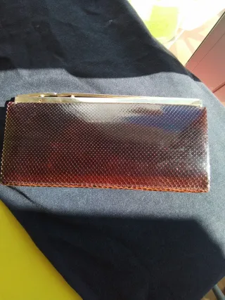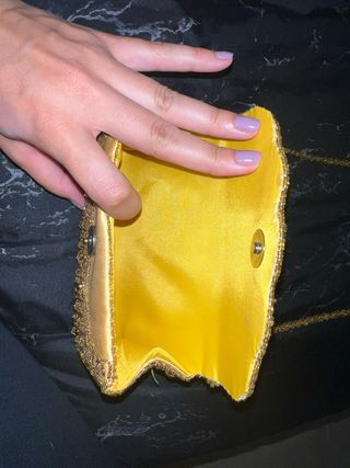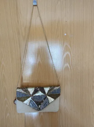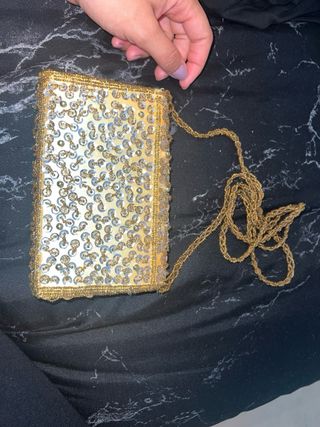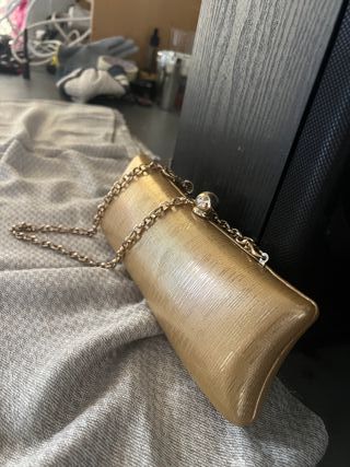 ✨ **Clutch dorado elegante tipo joya** ✨ Precioso bolso de fiesta rígido en color dorado, completamente recubierto de pequeñas cuentas metálicas que le dan un acabado brillante y muy sofisticado. Perfecto para bodas, eventos, cenas especiales o cualquier ocasión donde quieras destacar. ✔ Diseño tipo clutch rígido ✔ Cierre superior metálico ✔ Tamaño ideal para móvil, llaves, pintalabios y tarjetas ✔ Acabado brillante efecto joya ✔ Muy poco uso / excelente estado Es un bolso que eleva cualquier look, tanto con vestido como con conjunto más sencillo. Muy llamativo y elegante. 📏 Tamaño compacto y cómodo de llevar en la mano.