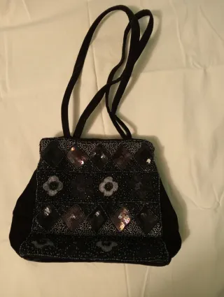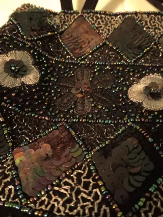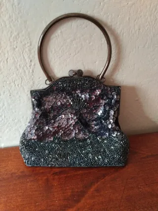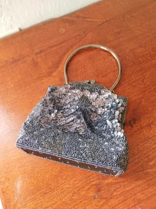 Elegante bolso de mano vintage, perfecto para ocasiones especiales. Su diseño combina lentejuelas brillantes y detalles de pedrería. - Asa metálica. - Cierre de broche.