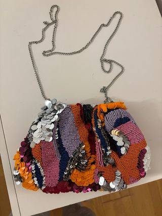 Bolso de mano o de hombro con un diseño vibrante y llamativo. - Adornado con cuentas y lentejuelas. - Cadena metálica plateada. - Estilo patchwork con múltiples colores.