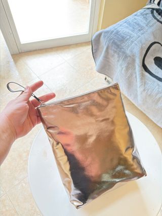 Elegante bolso de mano con un acabado metálico brillante. Su diseño moderno lo hace perfecto para complementar cualquier atuendo. - Cierre de cremallera. - Asa de mano. - Material sintético.