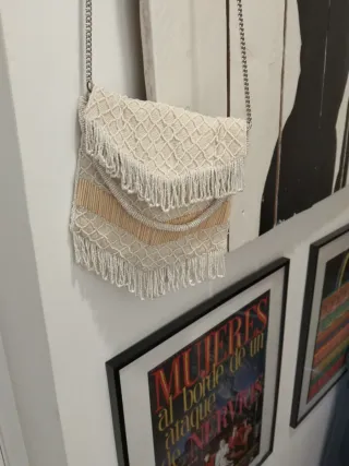 Elegante bolso de mano estilo vintage, perfecto para ocasiones especiales. - Diseño tejido en tono plateado. - Cadena metálica para llevar al hombro o como bolso de mano. - Cierre de broche metálico.