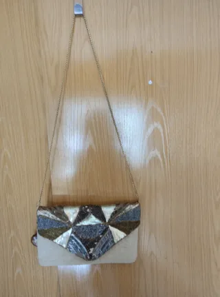 Elegante bolso de mano con un diseño geométrico iridiscente que cambia de color. - Acabado geométrico moderno. - Cadena metálica para llevar al hombro. Casi sin usar. Lo vendo por falta de espacio.