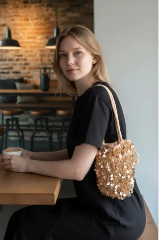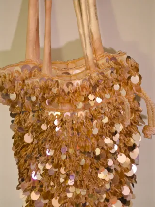 Bolso pequeño con un diseño llamativo y brillante. - Adornado con lentejuelas doradas. - Cierre de cordón. - Asa de cuerda.