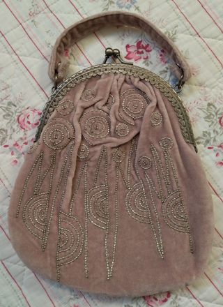 Bolsito de fiesta, estilo años 20. En terciopelo rosa, bordado con cuentas. Forro interior de raso.