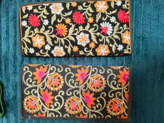 Elegante bolso de mano con un diseño intrincado. - Acabado en terciopelo negro. - Detalle de bordado dorado con motivos florales y geométricos. - Incluye pulsera para llevarlo cómodamente. - Mediadas 25x12 cm. - Hecho en Pakistán. Cada uno por 5 euros.