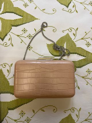 Elegante bolso de mano con un diseño texturizado que imita la piel de cocodrilo. Perfecto para complementar tu atuendo en ocasiones especiales. - Acabado en efecto piel de cocodrilo. - Cadena metálica para llevar al hombro o cruzado. - Cierre de clip metálico.