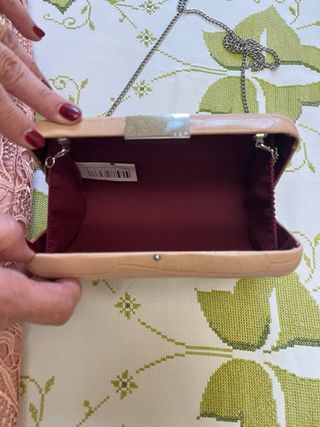 Bolso de fiesta de tela beige con algo de brillo. posibilidad de llevar como cartera, con asas cortas de 17 cm o con asa larga. Mide 24cm de largo, 12 cm de alto y 5,5 cm de fondo. Solo usado una vez