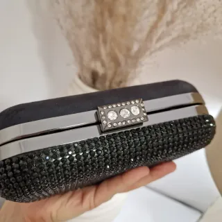 Elegante bolso de mano, perfecto para ceremonias y eventos especiales. Su diseño combina una base negra con una cubierta adornada con vibrante pedrería. Usado sólo una vez - Cierre metálico. - Acabado tipo ante.