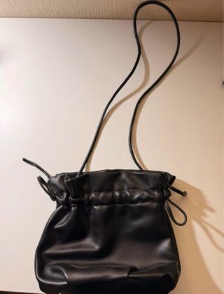 Bolso tipo bombonera de material sintético. - Cierre fruncido con cordón. - Asa larga ajustable. sólo usado una vez
