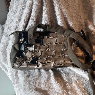 Elegante bolso de mano con un diseño moderno y sofisticado. - Acabado metalizado plateado. - Detalle frontal en color beige. - Asas cómodas para llevar en la mano o antebrazo. - Asa larga para llevar al hombro - Cierre superior con cremallera. - Tiene pequeños desperfectos como se ve en las fotos pero nada más.