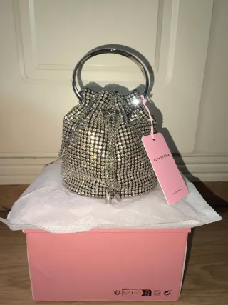 Bolso saco de la marca Alma en Pena, con un diseño llamativo cubierto de pedrería. - Asa de aro metálica. - Cierre de cordón. - Detalle de pedrería brillante. - Contiene bolsa de protección blanca y otra de tela