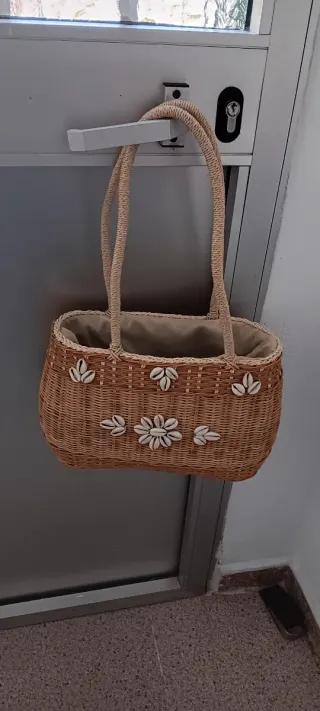 Bolso de mano tejido en mimbre, con un diseño único adornado con conchas marinas. - Material: Mimbre y conchas. - Asas de cuerda. - Forro interior de tela.