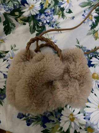 Bolso suave de forma redonda con un diseño mullido. - Material exterior de pelo sintético. - Asas de mano trenzadas. - Correa larga ajustable.