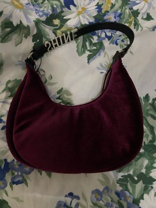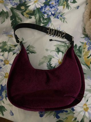 Bolso de terciopelo con un diseño moderno y llamativo. - Material: Terciopelo. - Color: Morado. - Adorno metálico con la palabra SHINE en la correa. - Correa negra ajustable.