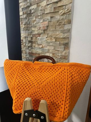 Bonito bolso hecho a mano con un diseño tejido. - Asa de madera. - Color naranja vibrante. - Amplio