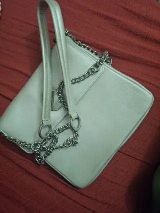 Elegante bolso de mano con un acabado plateado brillante y detalles de cadena metálica. - Diseño cuadrado. - Asa superior. - Cadena metálica para llevar al hombro o cruzado.