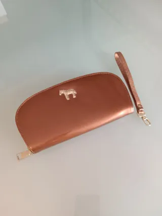 Elegante bolso de mano con un acabado brillante y un diseño moderno. Detalle de caballo dorado en el centro superior. Incluye una correa de quita y pon para llevarlo cómodamente. - Efecto brillo. - Correa de mano. - Cierre de cremallera. Medidas: Alto:11cm Ancho:22cm Grosor:3cm Correa de 18cm