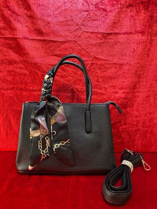 Dale un toque sofisticado a tu look con este bolso de mano en color negro. El detalle del pañuelo estampado en el asa le da un aire muy exclusivo y femenino. Versatilidad: Incluye una correa larga ajustable para llevarlo como bandolera si prefieres ir más cómoda. Calidad: Piel sintética con textura granulada muy resistente y fácil de limpiar. Detalles: Herrajes dorados que resaltan sobre el negro. El pañuelo es extraíble, por lo que puedes cambiarlo o quitarlo según tu estilo. Estado: Nuevo a estrenar. Nota: También lo tengo disponible en color beige en mi perfil. ✨