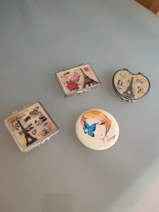 Conjunto de cuatro espejos de mano con diseños variados perfectos para llevarlos siempre en el bolso - Un espejo con diseño de rosas y Torre Eiffel. - Otro espejo con diseño de la Torre Eiffel y Venecia. - Un espejo en forma de corazón con la Torre Eiffel y mariposas. - Un espejo redondo con ilustración de una chica y una mariposa azul. Medidas aproximadas 7*7